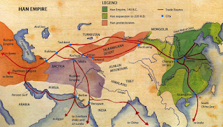 Fue la dinastía Han (206 a.C. a 220 d.C.) la que decidió expandirse hacia el oeste y derrotó a las tribus que bloqueaban las rutas occidentales. En 119 a. C. el corredor de Gansu se abrió al comercio y se liberó un pasaje de 600 millas hasta Dunhuang. Esto marcó la creación de las Rutas de la Seda. Desde Dunhuang se trazaron dos rutas hasta Kashgar, al norte y al sur del desierto de Talkamalkan. Después la ruta se dividió otra vez. La carretera del sur atravesaba los valles montañosos del Hindú Kush, donde el imperio Kushan actuaba como comerciante intermediario. El camino del norte pasaba por Tashkent y Samarcanda. Así, la ruta llegó a la antigua capital persa Susa. China también comerciaba con el oeste a través de rutas marítimas hacia la India y el Golfo Pérsico, así como hacia Egipto. Palmira y Petra fueron los puntos comerciales entre Arabia y el Mediterráneo. Estas rutas terrestres y marítimas conectaban todo el continente euroasiático y uno de los principales productos era la seda.